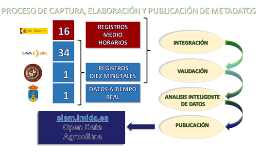Cada hora los datos almacenados en el datalogger de la estación son enviados al servidor del SIAM- IMIDA, para su validación, según la Norma UNE 500.540: 2004, para su validación por el Equipo de Agrometeorología y puestos al servicio de los usuarios desde la página Web siam.imida.es.