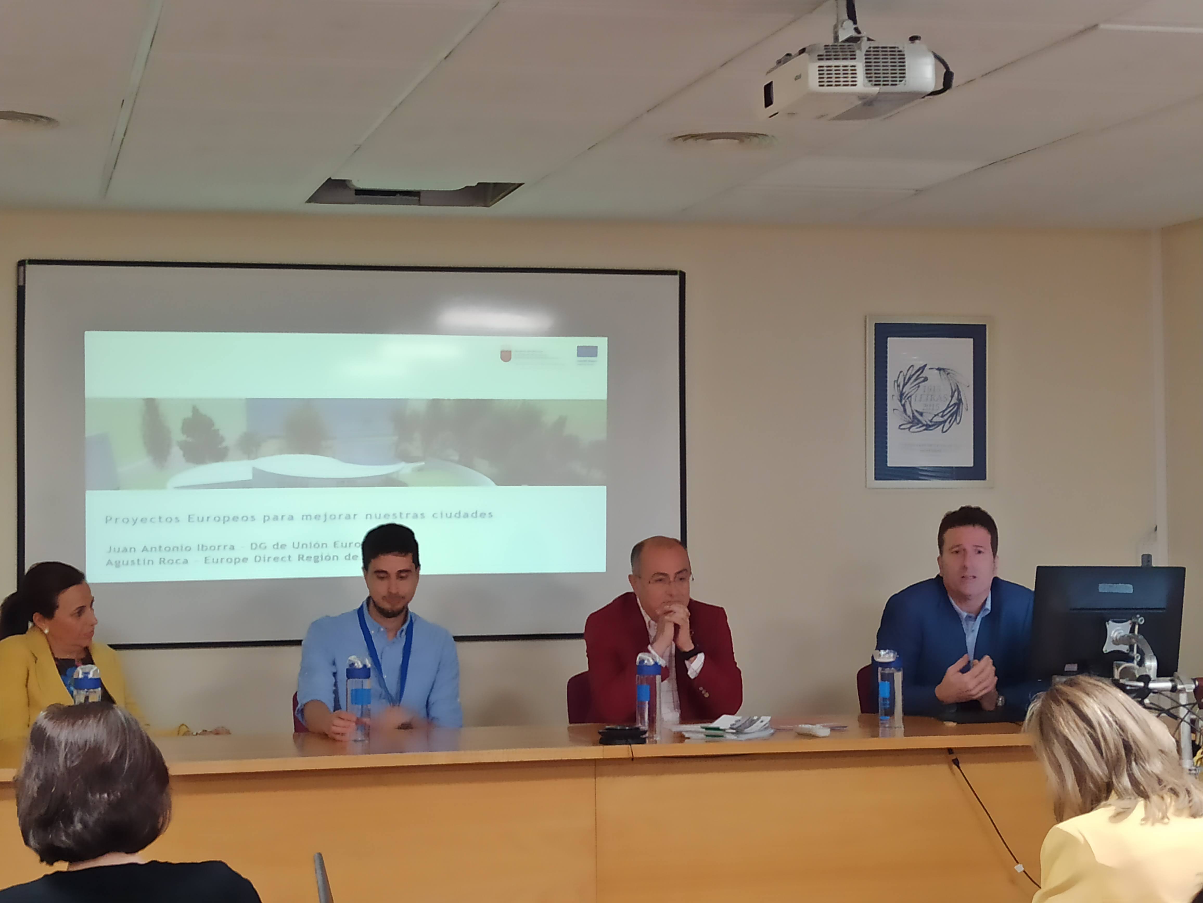 • Proyectos Europeos para mejorar nuestras ciudades, en la que participaron Antonio Fuentes, del Centro Europeo de Empresas e Innovación de Murcia (CEEIM); Manuel Pato, de la Federación de Municipios de la Región de Murcia (FMRM); Carmen Sandoval, de la Consejería de Fomento e Infraestructuras; y Juan Antonio Iborra, de la Dirección General de Unión Europea.